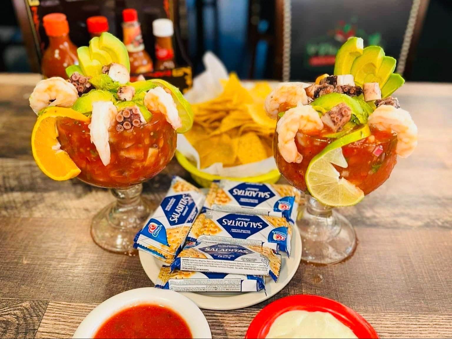 Popular Mexican dish made of raw shrimp submerged in lime juice & seasoned with Mexican spices, cilantro, cucumber & onions. Served with avocados & Saltine crackers